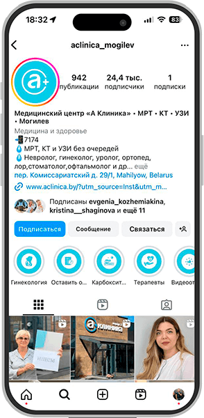 "А Клиника" в Могилеве - это принципиально новый подход к организации работы медицинского центра. К Вашим услугам самое современное оборудование и высококвалифицированные специалисты, имеющие многолетний опыт работы в лучших белорусских и зарубежных клиниках. Мы используем высокотехнологичные методы диагностики и лечения, а также непревзойденное качество медицинских материалов, что позволяет обеспечить нашим пациентам наилучший результат диагностики. Специально для Вас мы гарантируем отсутствие очередей даже на самые востребованные услуги, а также оперативность и комфортность обслуживания. После получения результатов обследования пациенты могут обратиться к нашим врачам за консультацией по организации дальнейшего лечения.