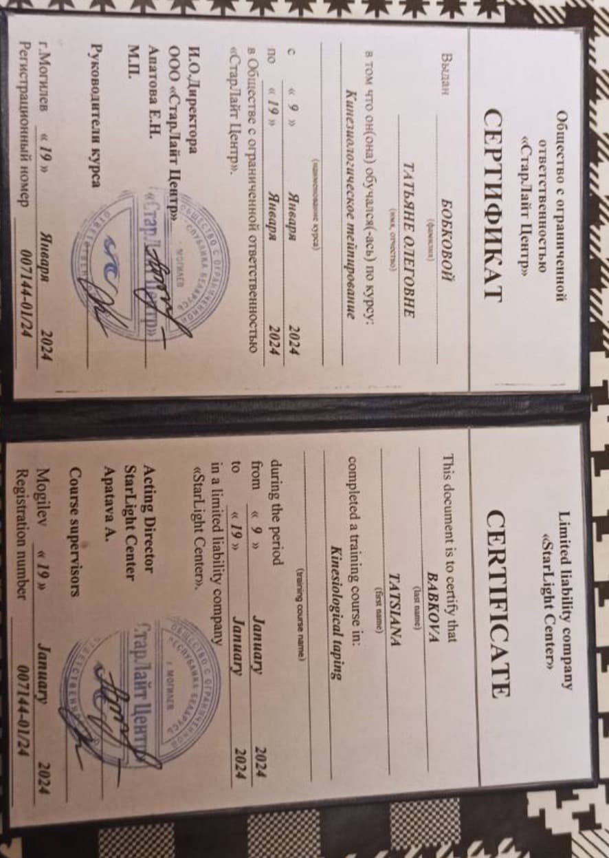 2024 г. - прошла курс "Кинезиологическое тейпирование".