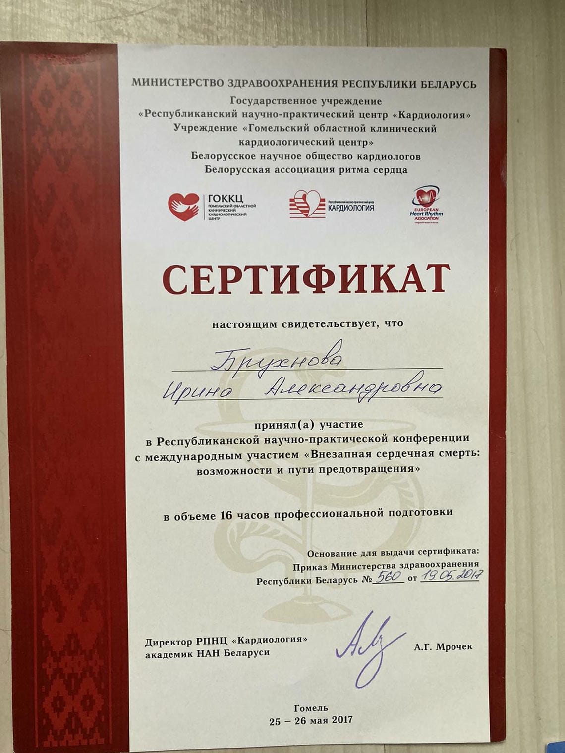 2007г. - г. Витебск, ВГМУ «Диагностика и лечение неотложных состояний в клинике внутренних болезней».