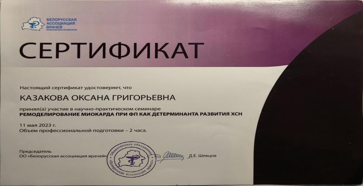 2019 г. Курсы повышения квалификации «Первичные и вторичные кардиомиопатии». Курс лекций для врачей «Головокружение диагностика и лечение». Курс лекций «Амбулаторная психиатрия для врачей общей практики, терапевтов, неврологов». Курсы лекций по аритмологии 1.0 и 2.0 кардиошкола. Курс лекций для врачей общей практики, терапевтов, кардиологов «Пороки сердца».