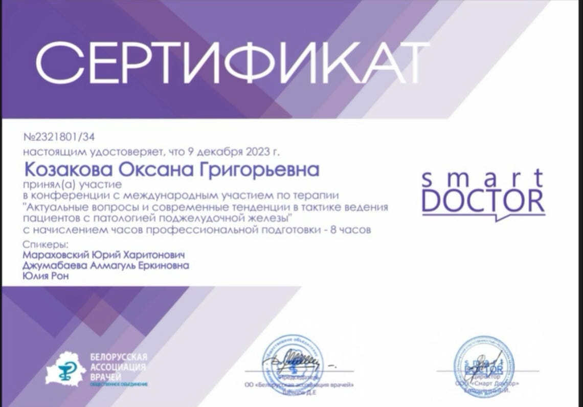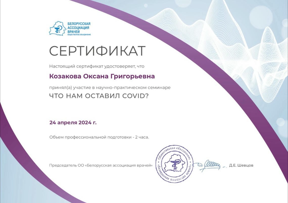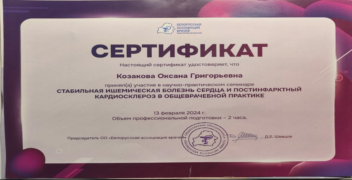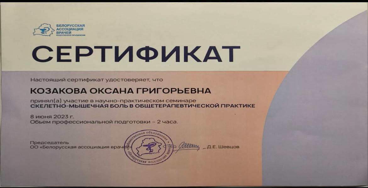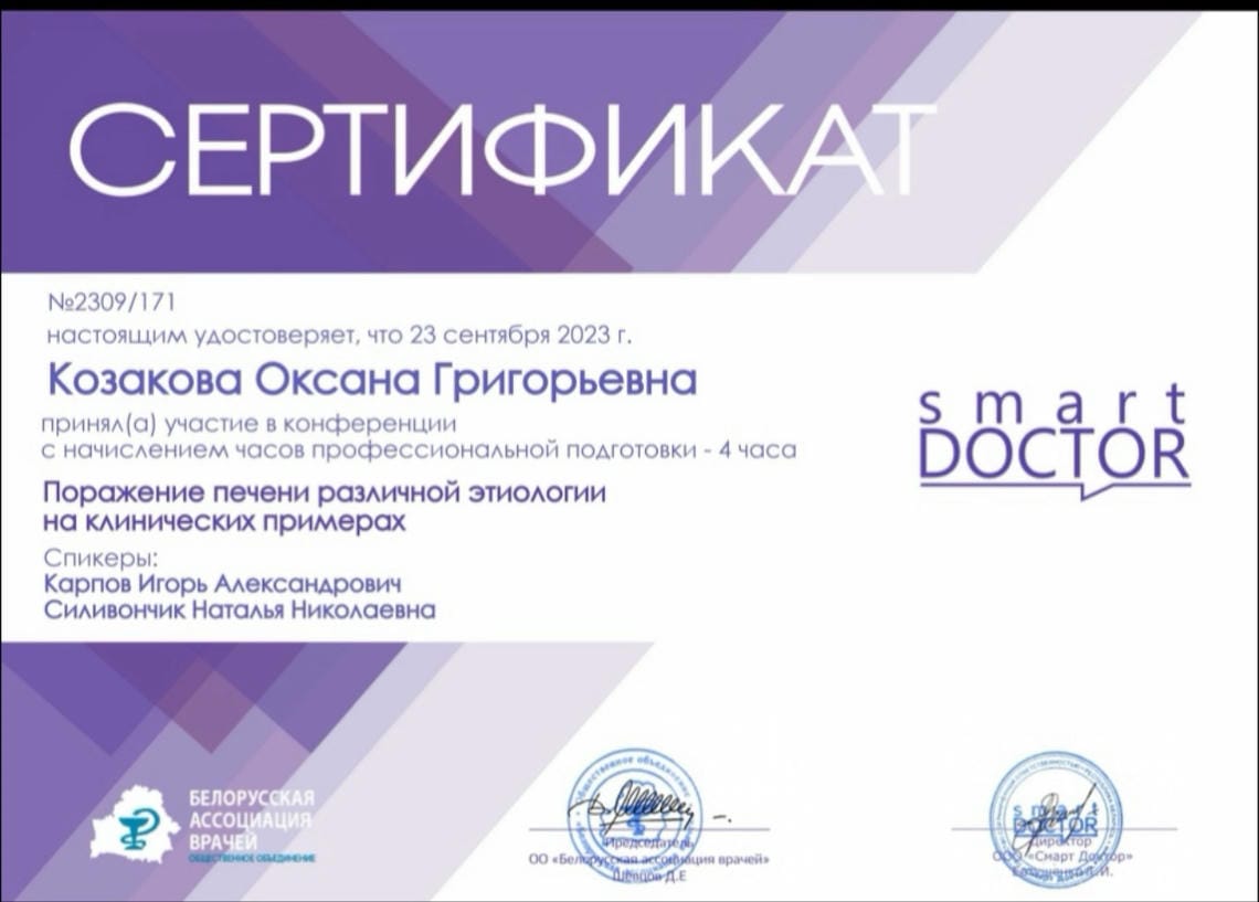 2021 г. Курсы повышения квалификации БелМАПО «Неотложная терапия». «Применение антидепрессанта в общей клинической практике» Н. В Латышева. Клиника головных болей и вегетативных расстройств Академика Вейна. Курс лекций «Амбулаторная ревматология» для врачей амбулаторного звена.