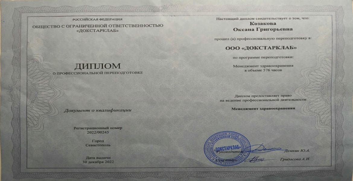 2011 г. Переподготовка по специальности общая врачебная практика. На базе ВГМУ.