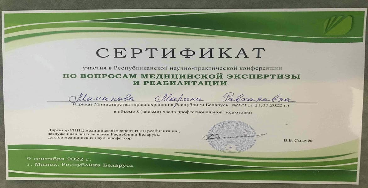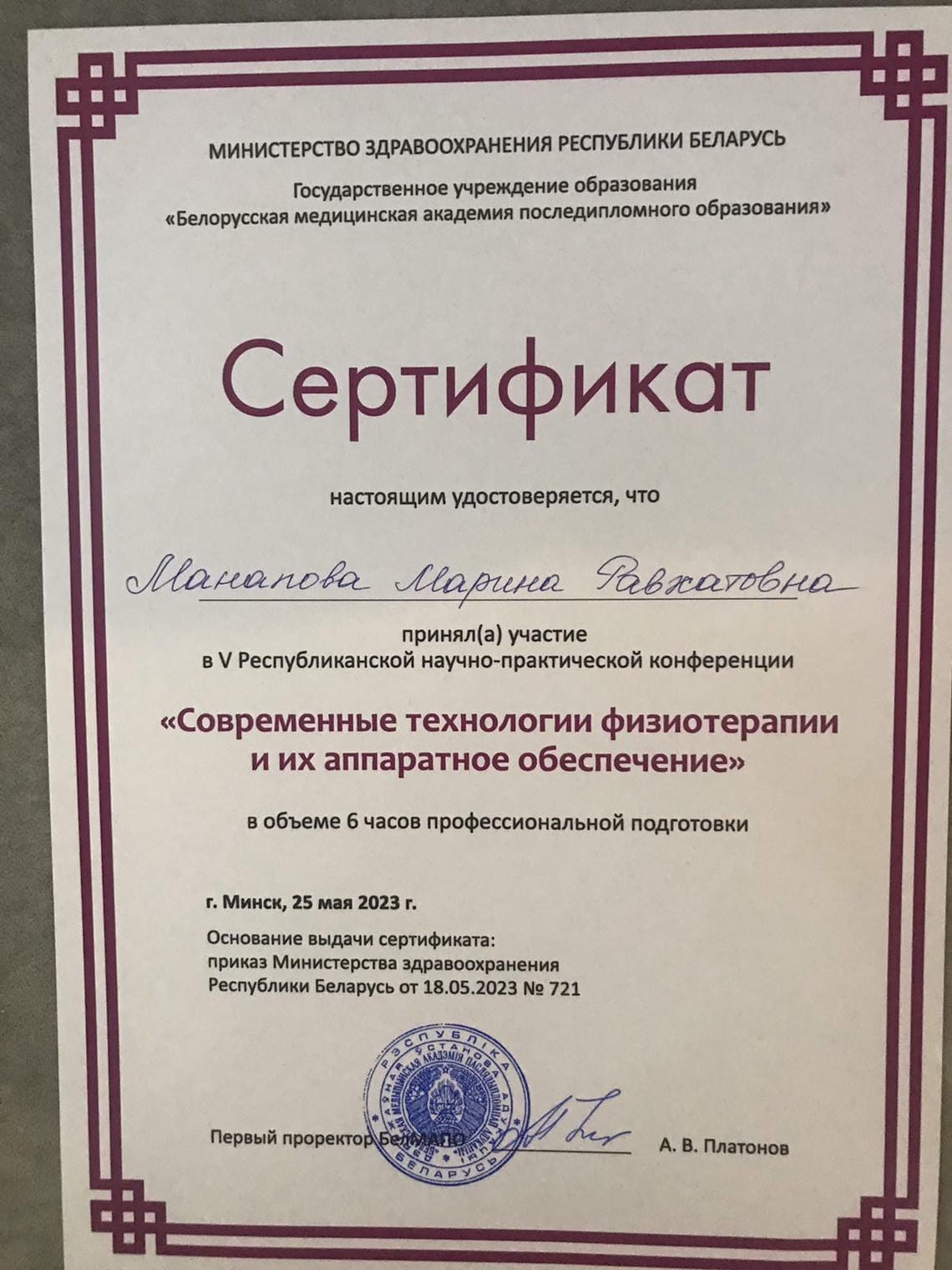 май 2015 г. – «Современные аспекты реабилитации физиотерапии, ЛФК, рефлексотерапии»;