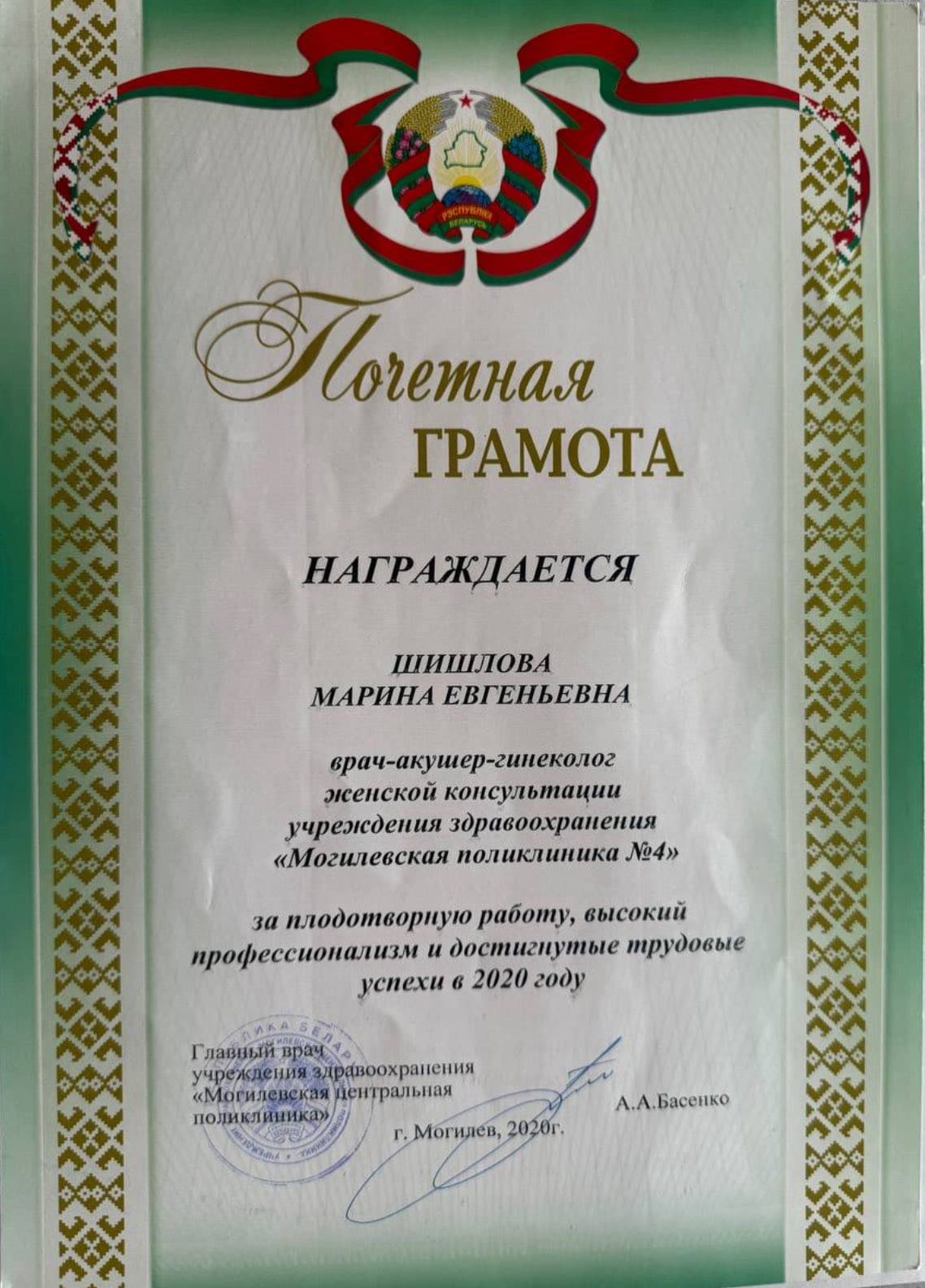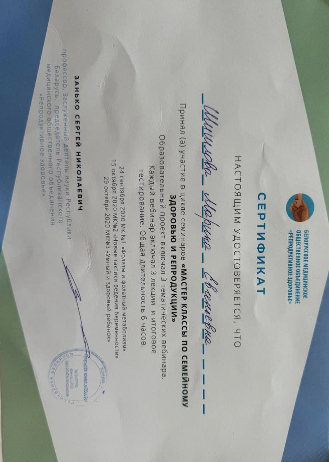 - "УЗ-диагностика в специальности:УЗ-диагностика патологии матки и придатков со стажировкой "УЗ-диагностика матки в первом триместре беременности" 04.12.23-29.12.23, УО "ГГМУ".