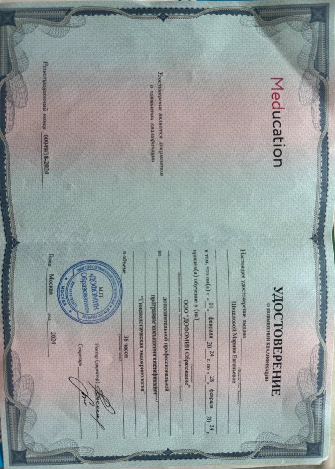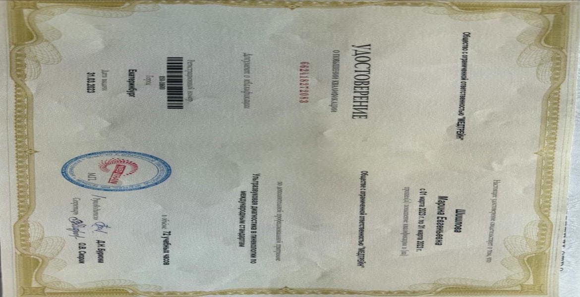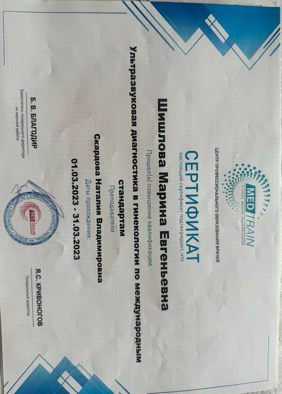 - "Ультразвуковая диагностика в гинекологии по международным стандартам" (ООО "Медтрейн" г.Екатеринбург") 01.03.2023-31.03.2023