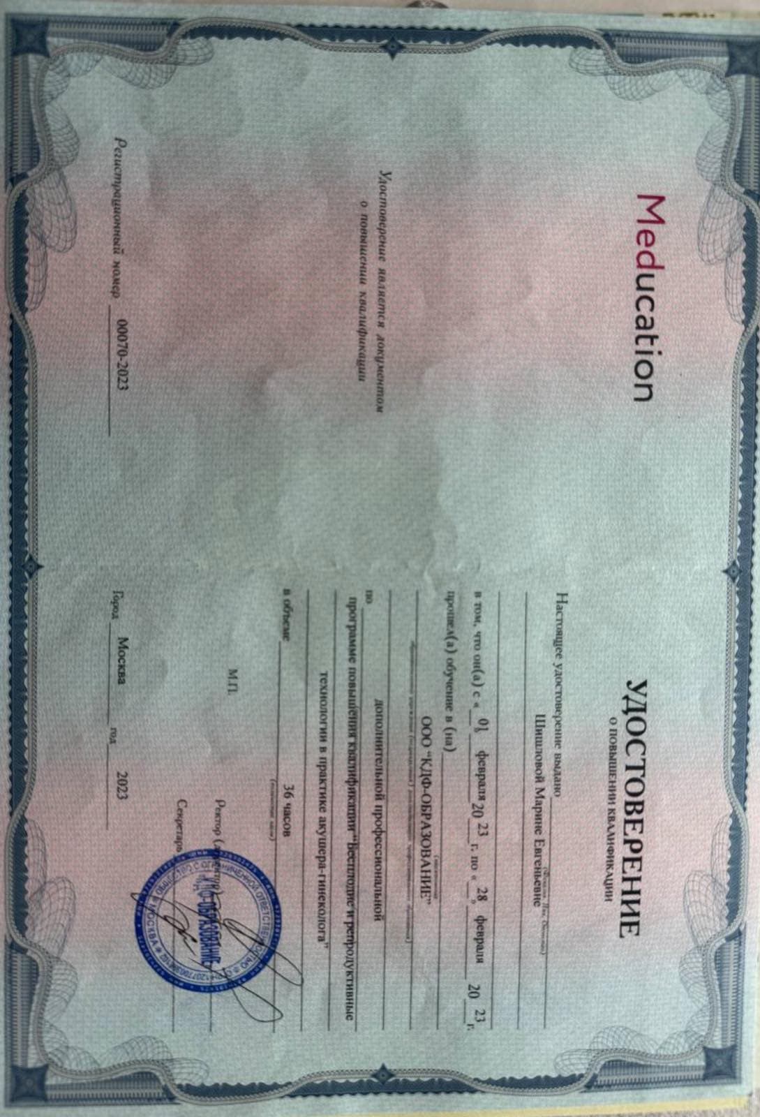 - "Бесплодие и репродуктивные технологии в практике акушера-гинеколога" ООО "КДФ-ОБРАЗОВАНИЕ" г.Москва 01.02.2023-28.02.2023