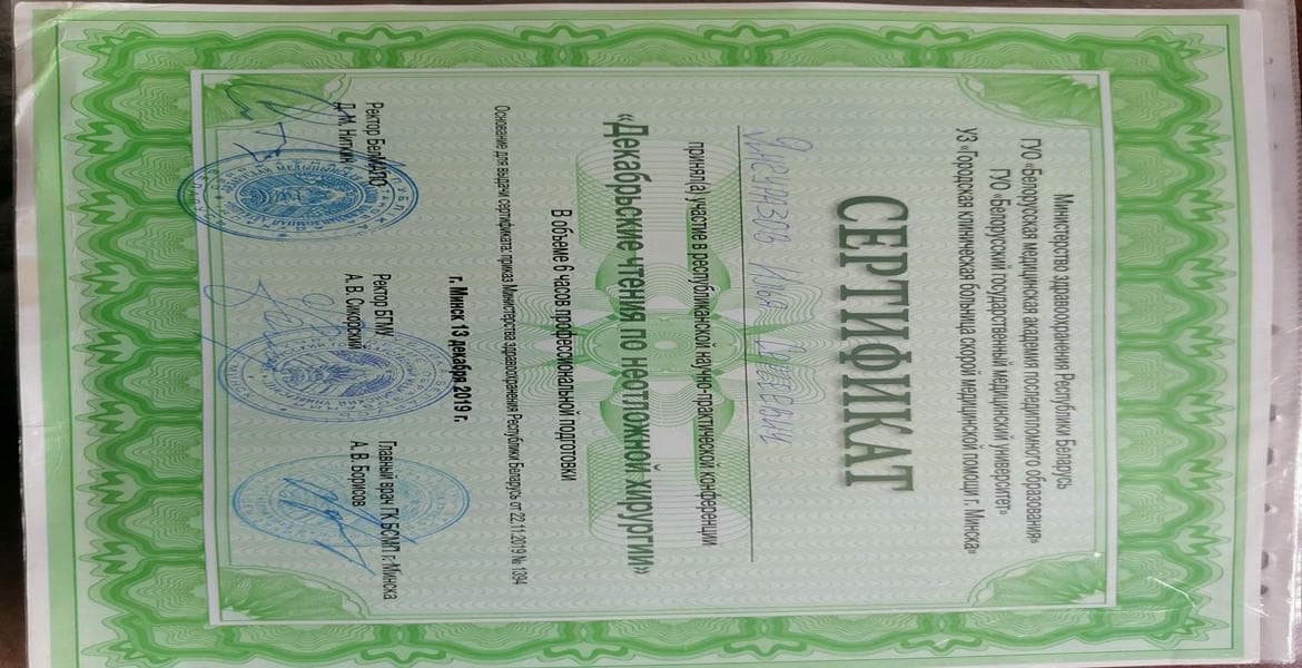 2018 г. – ГУО «Белорусская медицинская академия последипломного образования» г.Минск «Хирургия сосудов и абдоминальная хирургия».