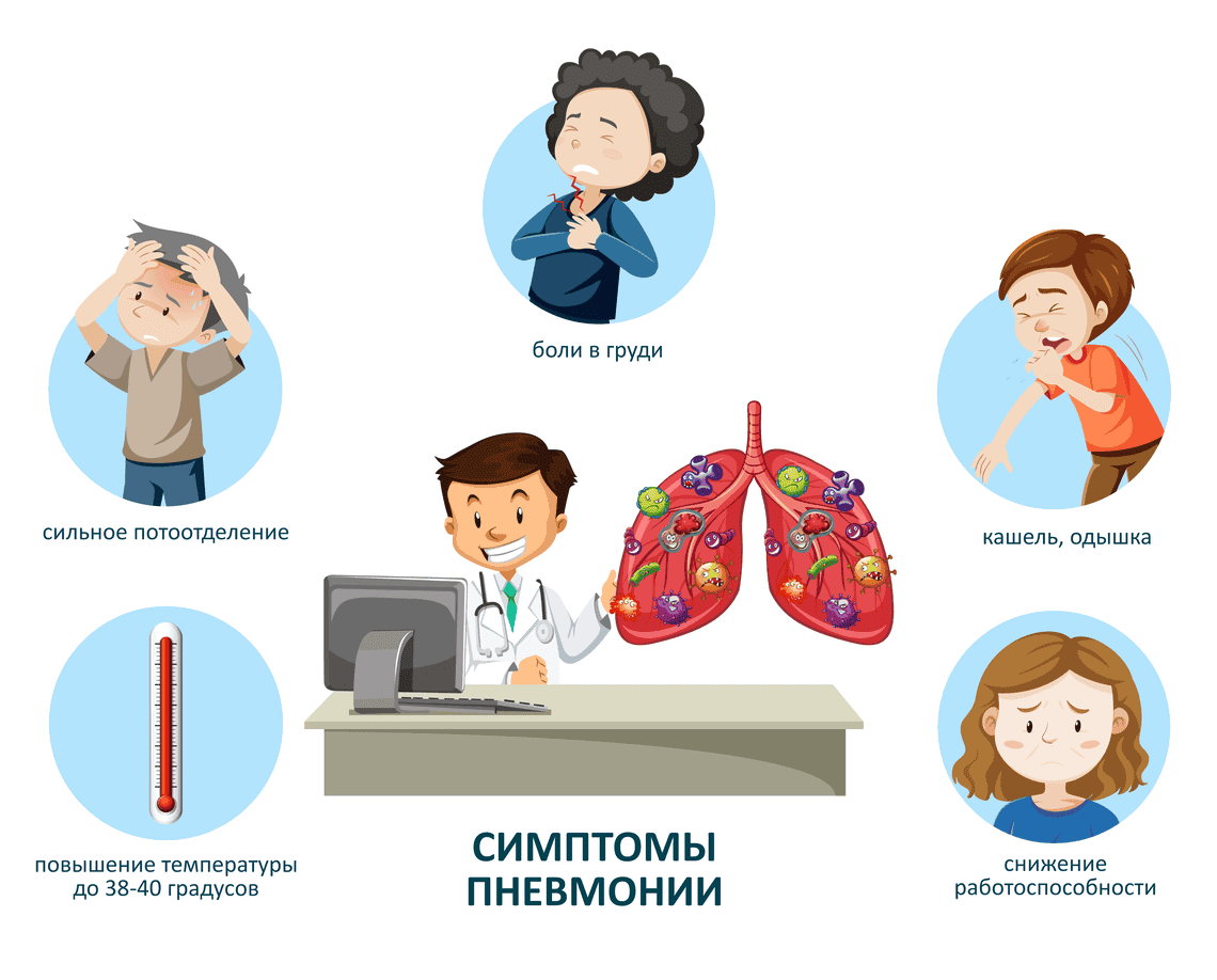 | Симптомы заболевания: • повышение температуры до 38-40 градусов, • кашель, • одышка, • выделение мокроты, • сильное потоотделение, • боли в груди, • снижение или потеря аппетита, • снижение работоспособности, • нарушение сна. | ![]() |