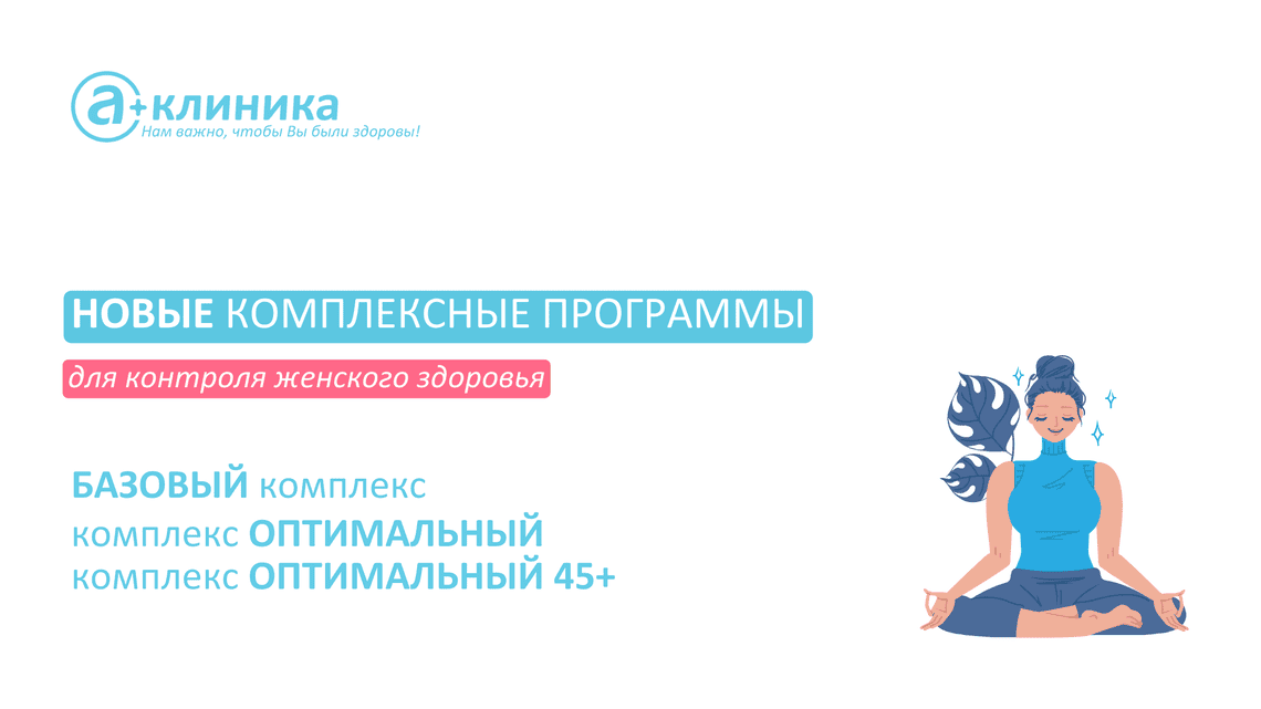 Два других комплекса подходят для ежегодного контроля женского здоровья. Это расширенные программы, состав которых зависит от возраста женщины. Программа «ОПТИМАЛЬНЫЙ комплекс «Женское здоровье» подходит для женщин до 45 лет, а «ОПТИМАЛЬНЫЙ комплекс «Женское здоровье 45+» подходит женщинам от 45 лет соответственно.