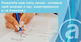 Личный кабинет Уважаемые посетители медицинского центра "А Клиника"! С 10 октября мы ввели анкетирование наших пациентов. Это сделано для того, чтобы увидеть мнение КАЖДОГО о нашем медицинском центре, прийти к определенным выводам, и безусловно, чтобы стать лучше специально для вас. Мы заботимся не только о здоровье наших посетителей, но также и о комфортном пребывании в стенах "А Клиники".